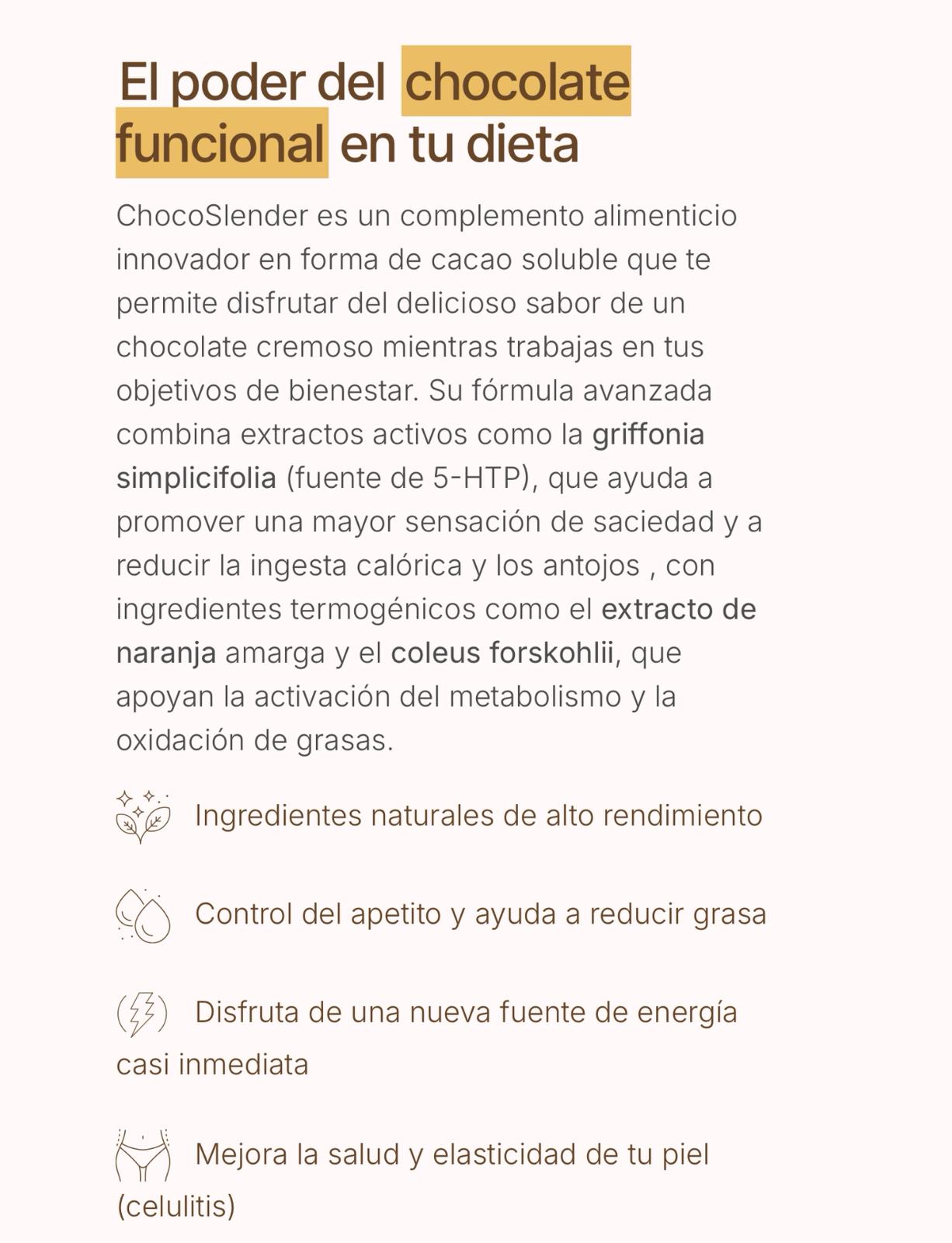 Chocoslender es un delicioso chocolate soluble funcional diseñado para apoyar tu bienestar físico y mental mientras disfrutas de un sabor irresistible. Su fórmula combina ingredientes naturales cuidadosamente seleccionados que actúan en sinergia para favorecer el equilibrio, la energía y el control del apetito.